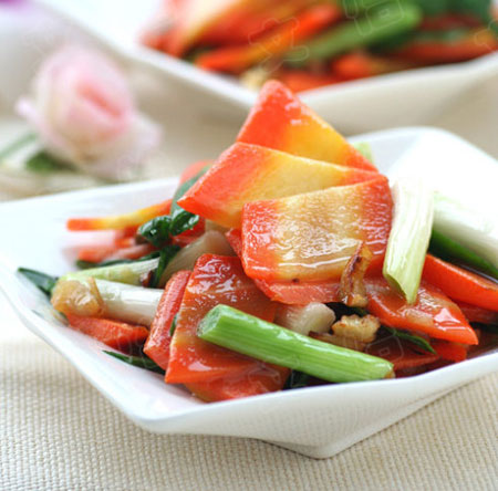 4建议大家买体型比较细小的黄芯胡萝卜,口味比较好;喜欢吃辣口味的,可以在炸蒜之后,再放一些郫县辣酱,炒香后再倒入胡萝卜片,其他程序都一样哈。